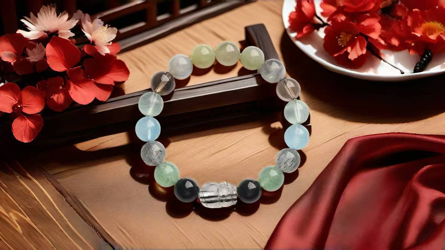 Obsidian and Green Strawberry Quartz Pi Xiu Bracelet – Compensating for the Lack of Metal and Earth Elements